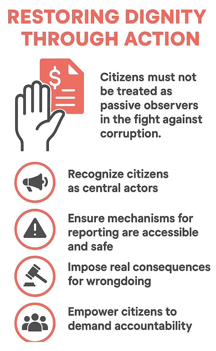 Citizens must not be treated as passive observers when it comes to the fight against corruption. Anticorruption bodies and governments should recognise citizens as central actors whose voices, experiences, and grievances shape the integrity of public life. If mechanisms for reporting corruption are difficult to access, lack credibility, or place individuals at risk, then those systems fail the very people they are meant to serve. Equally, if there are no real consequences for wrongdoing, then efforts to fight corruption amount to little more than empty performance.